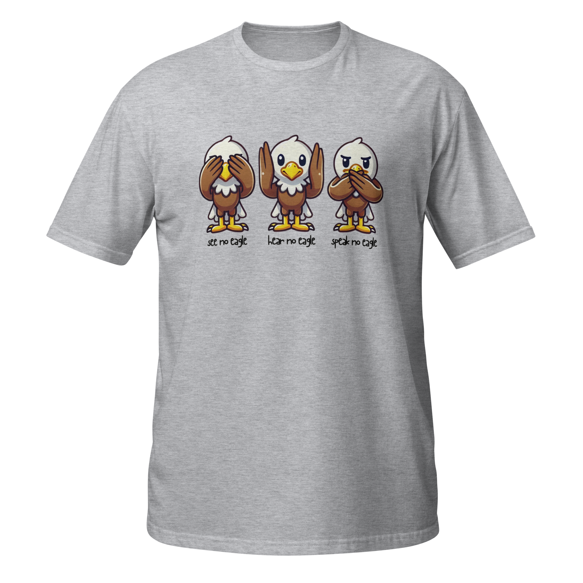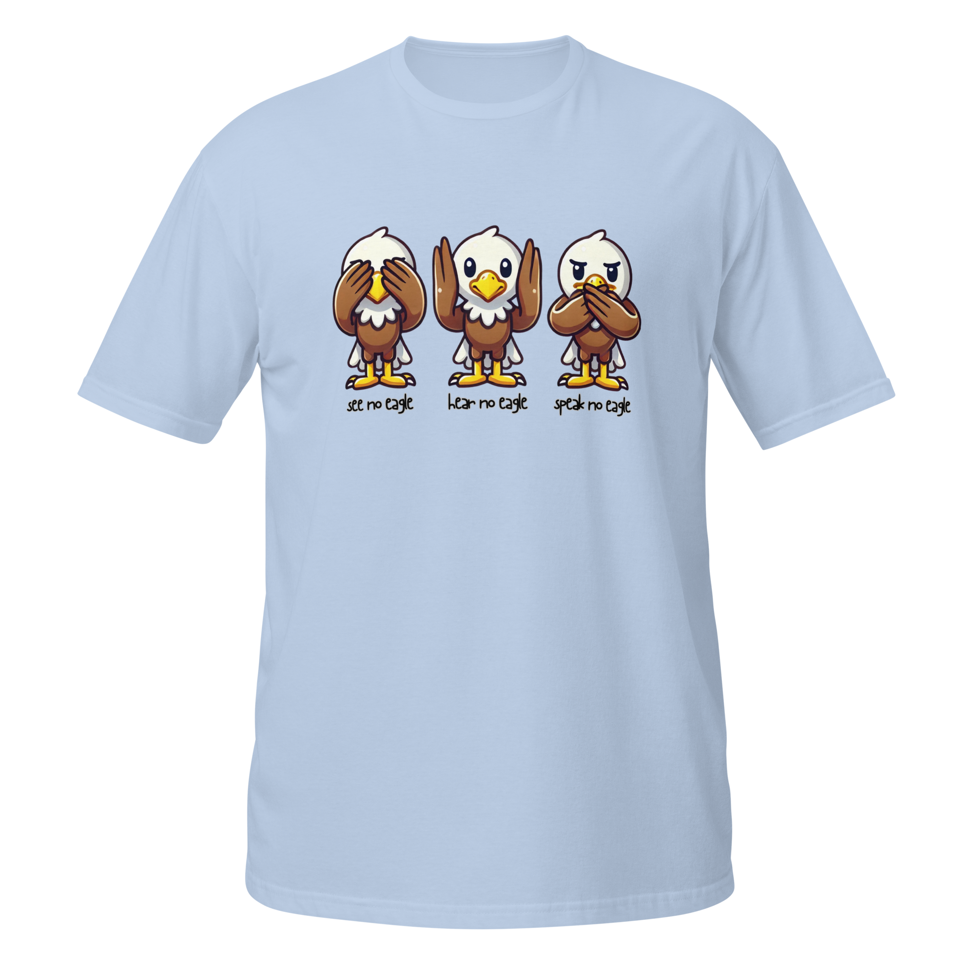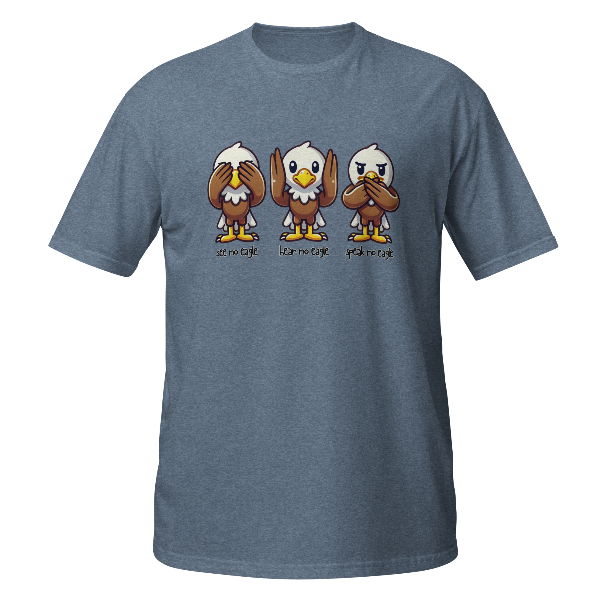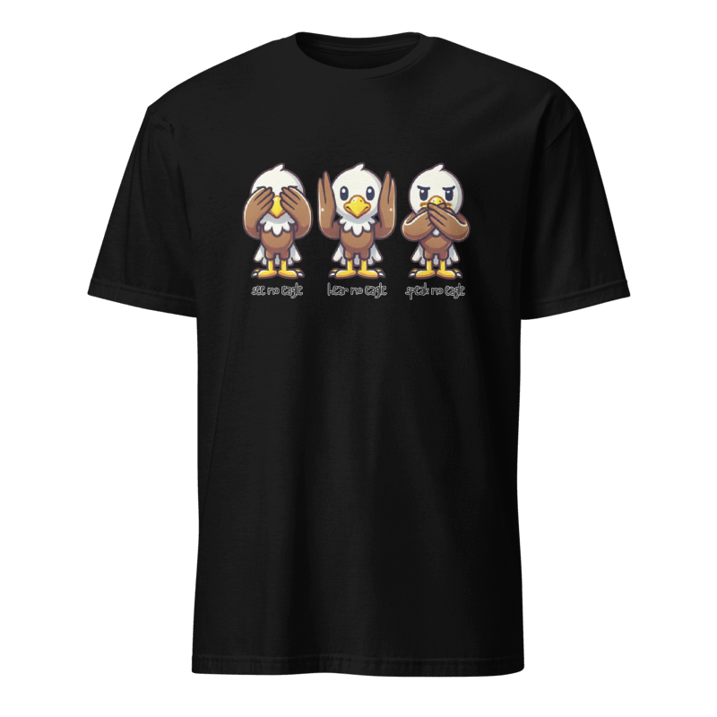 These cartoon eagle flips the classic see, hear, speak no evil into a bold, playful design that’s as fun to wear as it is to show off. Soft, comfortable, and made to turn heads — whether you’re flying solo or flocking with friends. It’s made of 100% ring-spun cotton and is soft and comfy. The double stitching on the neckline and sleeves add more durability to what is sure to be a favorite!